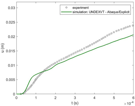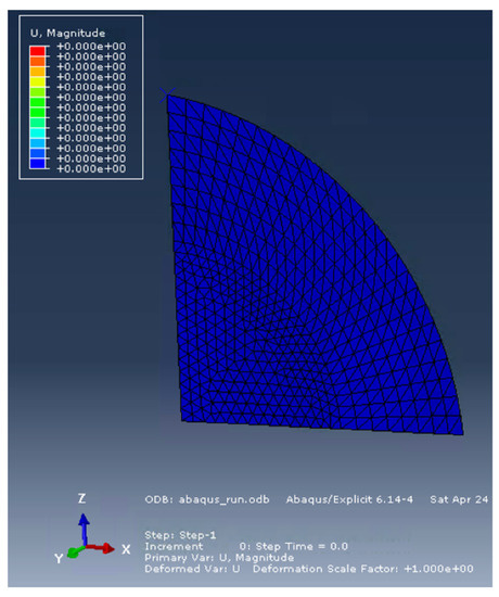 Deformation of the plate under the blast at 0.00145 s is shown in Figure 24. The deflection time history at the center of the plate is plotted in Figure 25 compared to the results measured from the LS_DYNA simulation performed by Webster [25]. The variation of the explosive gaseous bubble over time is shown in Figure 26. The time history of its radius is plotted in Figure 27 with the results measured from the simulation performed by [25]. Actual experimental data are unpublished. Only reference figures were available for extracting bubble radii.