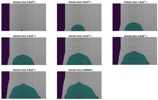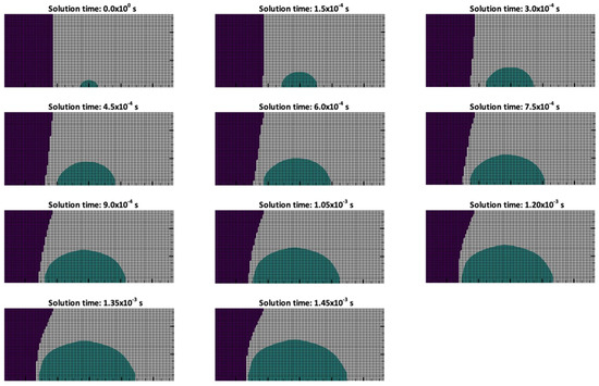 The shock that reflects off the wall travels back and eventually comes in contact with the explosive gas and they interact with each other, creating an expansion zone that lowers the density and pressure of the fluid and thus forms another cavitation zone [15,36] as marked in the fourth contour of Figure 13 using a yellow circle. This cavitation collapses as well and forms a new shock wave that impacts the wall again [15,36], as illustrated in the sixth contour of Figure 13. The wall then deforms with acceleration again. This process repeats until the energy of the fluid gradually decays and eventually the deformation of the structure stabilizes around a permanent value of deformation.