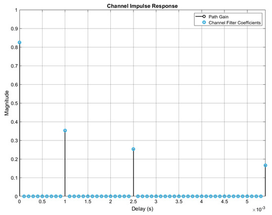 where and are the ambient noise and the Rician fading impulse response [39,40] modelled together with the Doppler shift using the Rician object in MathWorks MATLAB R2019. Figure 3 represents the sample delay profile and path gains.