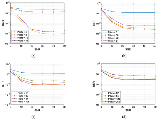 BER as a function of the number of pilots for CP-OFDM with a transmitter-receiver distance of 50 m: (a) 64 subcarriers; (b) 128 subcarriers; (c) 256 subcarriers; (d) 512 subcarriers.