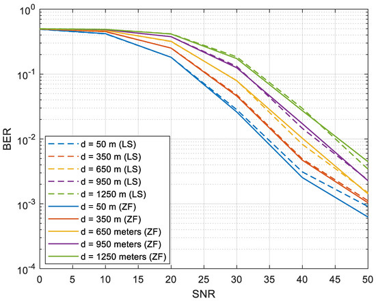 Figure 8 shows the BER performance for the LS and ZF equalizers when the transmitter-receiver distance was varied from 50 m to 1250 m. The number of subcarriers used was 128 with 32 pilots and BPSK was used in the mapper. The behavior that was observed in Figure 6 and Figure 7 was also noted in these figures. However, the BER was marginally inferior in this case owing to a higher number of subcarriers.