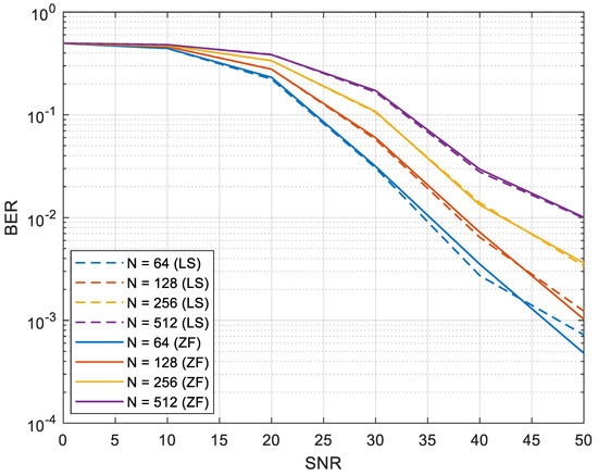 Figure 9 shows the BER performance for the LS and ZF equalizers when the number of subcarriers was varied from 64 to 512 and QPSK was used in the mapper. The number of pilots in both cases was one-fourth the number of subcarriers and the transmitter-receiver distance was kept constant at 500 m. It was observed that the performance with the ZF equalizer was marginally better than that of the LS equalizer. Moreover, as the number of subcarriers increased, the BER degraded owing to an increased ICI. We also provide a summary of our findings in Table 2 for a fixed SNR of 40 dB. It was evident that the BER deteriorated with the number of subcarriers.