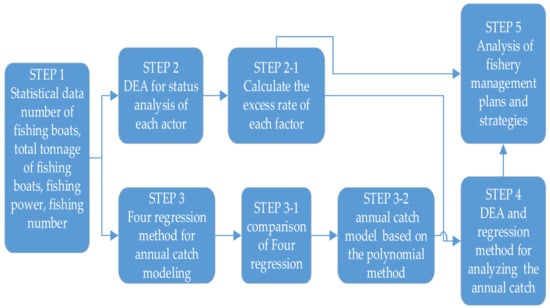 Initially, we explained the source and collection of data. In this study, DEA was used in fishing efficiency evaluation, and input and output analysis on fishery management was conducted. We compared four regressions and chose the better regression model. Furthermore, DEA and improved regression models were used for data simulation. Finally, fishery management plans and strategies were proposed based on this. The flowchart of the methodology used in this paper is shown in Figure 1.