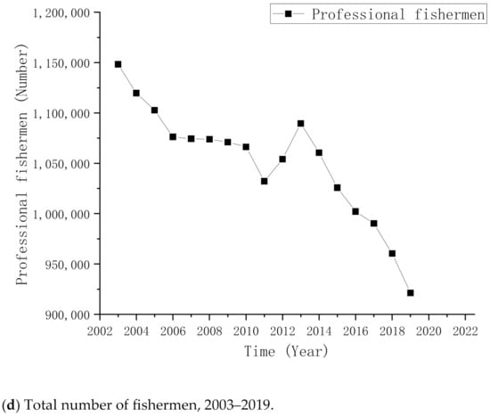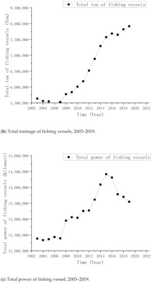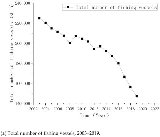 Since the “13th Five-Year Plan” period, based on improving fishery law and adhering to the fishing licensing system, China’s management policy for offshore fishery has mainly been placed in input-based management mode. Major policies were implemented, including implementing total management of marine fishery resources in 2017 and implementing quota management for the offshore annual catch. A “dual control” policy was implemented for offshore fishing vessels, which means that the number and power of offshore fishing vessels are controlled, and the number and power of fishing vessels were reduced within five years [,,]. These two policies explicitly put forward for the first time intended to reduce the amount and power of offshore fishing vessels with a specific number and offshore annual quota in the history of Chinese fishery management [,].