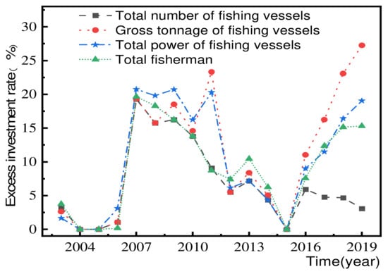 The results of excess investment rates of various factors are obtained, including the total number of fishing vessels, gross tonnage, total power, and the total number of professional fishing (Figure 3). Regarding the trends of the four factors, there was a common trend during the period from 2003 to 2015. However, after 2015, the total number of fishing vessels showed a decline differently from the other three. During the first four years of this period, excess investment rate was low (<5%). There was a sharp upward trend in 2007, then a gradual downward trend from 2007 to 2015, reaching a low point in 2015, and then an upward trend, with the highest gross tonnage of fishing vessels reaching 25.5%.