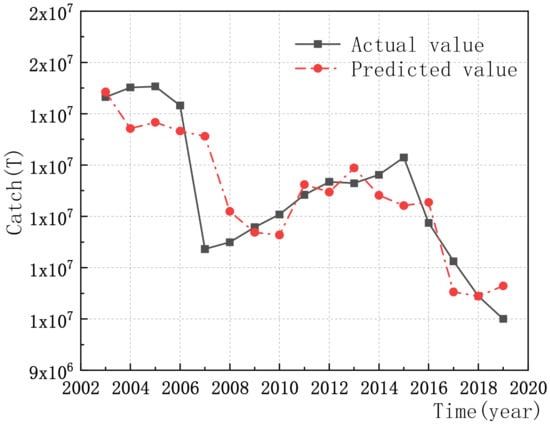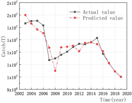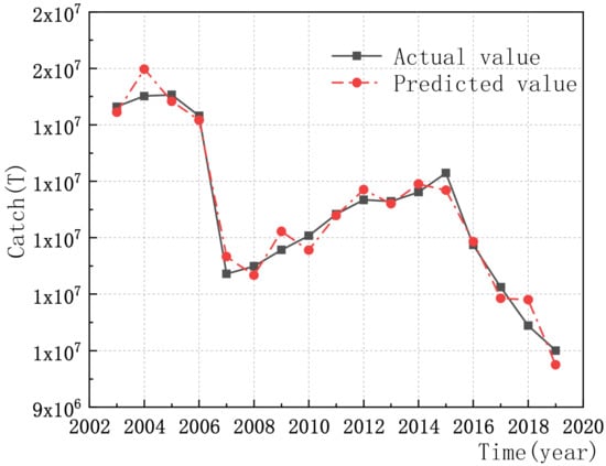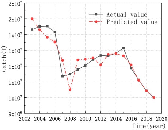In short, the Polynomial model is better than the other models. A regression model for the annual catch of China’s offshore fishery was established based on the Polynomial model, as shown in formula (8).