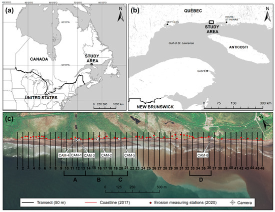 - Bandet, M.; Caulet, C.; Baudry, J.; Didier, D.; Dubuc, D.; Marion, N.; McKinnon, R.; Paul-Hus, C.; Caveen, J.; Sévigny, C.; et al. Programme de Mesure et de Modélisation de la Morphodynamique de l’Érosion et de la Submersion Côtière dans l’Estuaire et le Golfe du SaintLaurent (MoDESCo), Phase III: Rapport Final; Rapport Remis au Ministère de la Sécurité Publique du Québec; Chaire de Recherche en Géoscience Côtière, Laboratoire de Dynamique et de Gestion Intégrée des Zones Côtières, Université du Québec à Rimouski: Rimouski, QC, Canada, 2020; 259p. [Google Scholar]