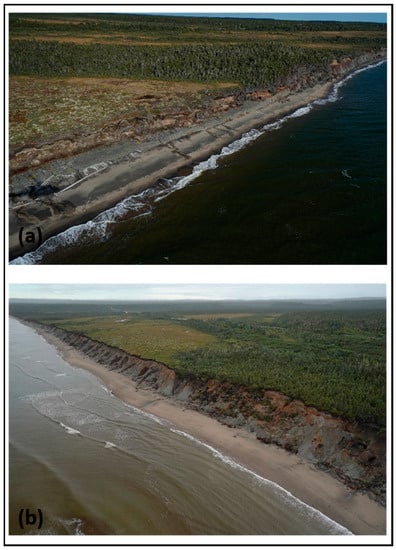 Climate-related factors, such as storminess, wind direction, water levels, and wave forcing are crucial environmental drivers in cliff evolution [15]. In the context of rising sea levels, most numerical or semiempirical models are based on the assumption that hydrodynamic processes drive cliff retreat [2,15,16]. However, non-marine hydrodynamic variables such as rainfall and frost action are also important [3,4,17,18]. Parameterization of these other variables into models is still at an embryonic stage, since few studies have attempted to quantify the interrelation between climatic variables (temperature, precipitation, freeze–thaw cycles, drought, etc.) and geomorphological processes related to erosion rates [18,19]. In cold regions, in addition to the classic erosion processes, cryogenic processes, which group together all the processes associated with freezing or thawing, also contribute significantly to cliff retreat. The intensity and frequency of several of these variables are set to change with global warming and accelerated sea-level rise [20]. In cold region shorelines, global warming is already affecting cliff erosion in two main ways. First, it increases the air thawing temperature, which favors the melting of the permafrost, which causes landslides, mudflows, and retrogressive thaw slump [21,22,23]. Second, the reduction in sea ice cover or the increase of the ice-free period duration leads to an increase in water–cliff-toe contact [20,24,25], which promotes thermoabrasion and basal notches as well as block collapse [12,26,27]. Some regions of the Arctic have already been experiencing accelerated coastal erosion in recent decades [5,23,25,28,29,30]. Because of the environmental changes induced by global warming, these hydroclimatic forcings will lead to an acceleration of the retreat of the coast [20,31].