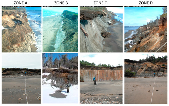 To identify erosion events and geomorphological processes and the environmental factors involved, four distinguishable zones (Figure 1 and Figure 3) were studied and equipped with six cameras (Reconyx model PC85—3.1 megapixels, USA) from December 2008 to December 2012 (Table 1). Zone A is characterized by a 25 m-wide sand and gravel beach with an average cliff height of 4.4 m (Table 2). An open peat bog occupies the inland area behind the cliff line along this part of the coast. Zone B is characterized by a progressive thickening of the basal silt–clay unit, an increase of the cliff height and a narrowing of the beach to circa. 10 m wide. A forest cover occupies the backshore. Zone C is quite different than Zone B except for the cliff height which reaches 6.2 m. The sandy unit overlaying the basal unit is almost absent and the orstein unit is absent. Here, the inland vegetation is herbaceous. The cliff height at Zone D reaches 11.2 m and is predominantly formed of the basal silt–clay unit followed by the sandy unit. Here, the beach is 15 m wide. The backshore is occupied by a forest cover which borders a peat bog.