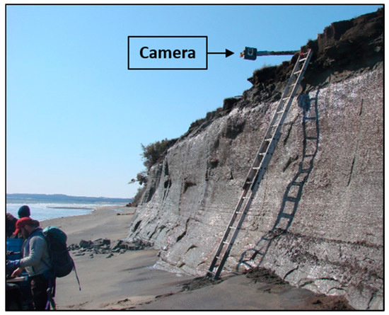 The cameras were fixed on a horizontal pole at the top of the cliff (Figure 4), so the acquired pictures were a profile view of the cliff covering about 30 to 40 m alongshore, where reliable information could be observed (Figure 3). Images were recorded every 15, 30, or 60 min (Table 1) over the period of study. The images were used to interpret environmental conditions and erosional characteristics across the study site (Table 3). Additional meteorological data (Table 4) were acquired from stations in Havre-Saint-Pierre, 60 km east of the study site (station numbers 7043019 and 7043020 [61]), and solar radiation was measured on site with a Li-cor pyranometer (LIS200S).