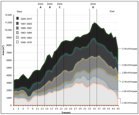 The average erosion rate calculated from historical aerial photographs for the whole study site was 2.2 m per year between 1948 and 2017. Erosion rates continuously increased from the 1980s to 2017 and the two recent intervals (1997–2005 and 2005–2017) recorded the highest rates of areas land loss seen throughout the historical period (Figure 5). Highest erosion rates were seen in Zone D where up to 220 m of cliff retreat occurred since 1948. Between 1997 and 2017, the average annual cliff retreat rate was respectively 2.6 m per year, 3.3 m per year, 4.0 m per year, and 4.2 m per year for zones A, B, C, and D.
