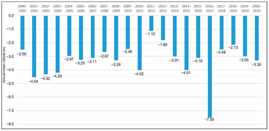 Based on 46 coastal erosion measurement stations for the study area (Figure 1), the average rate of retreat between 2000 and 2020 was 3.30 m per year (Figure 6). The periods of 2000–2010 and 2010–2020 were comparable in terms of mean retreat rate with respective values of 3.3 m per year and 3.2 m per year. The average annual erosion values allow to observe a great temporal variability between years with a maximum average retreat value of 7.50 m (2016–2017) and a minimum average retreat value of 1.12 m (2011–2012).