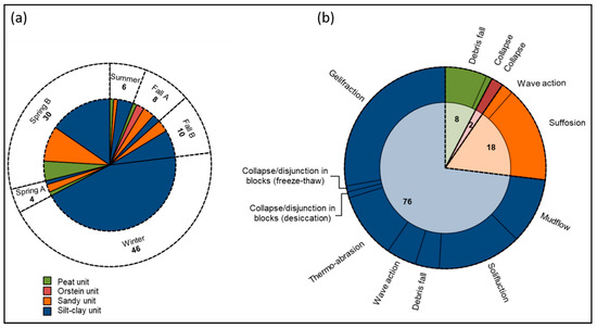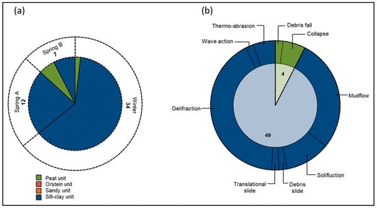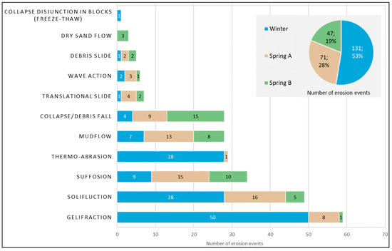 As the four zones were all monitored in winter and spring, it is possible to look at the distribution of the different types of geomorphological erosion processes for this period (Figure 11). Of a total of 249 events, 53% occurred in winter, 28% in early spring, and 19% in late spring. It can be seen in Figure 11, that in terms of the number of events observed, gelifraction, solifluction, suffosion, thermoabrasion, mudflows, and collapses are the main geomorphological processes observed. While sub-aerial and hydrogeological processes account for 86% of events, thermoabrasion and wave action account for only 14% of events.