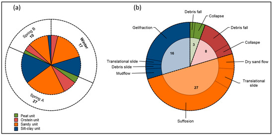 Number of events per lithological unit per season (a), and processes affecting the different lithologies in Zone B (b).