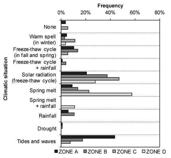 Through analyzing the daily and seasonal monitoring data with cameras, we were able to identify nine different climatic configurations that were closely related to cliff erosion (Figure 12). The majority of the erosive configurations were associated with the freezing season, in particular with freeze–thaw and melting processes. These processes are particularly efficient in the activation of silt–clay sediment [76,77,78] and caused high rates of erosion in our study zone.