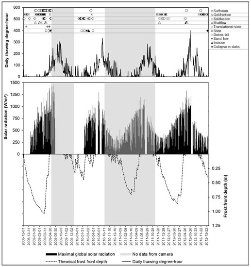 Chronology of the different cryogenic erosion events in relation to the processes, the daily degree hours, the solar radiation, and the frost front depth.
