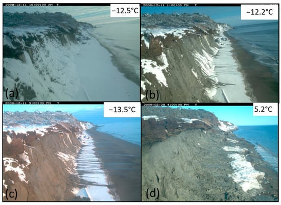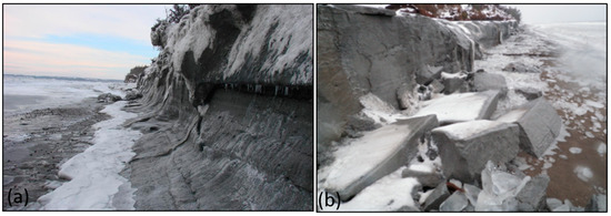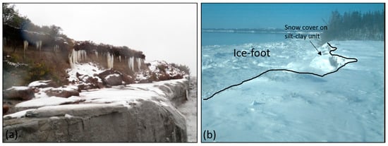 Other erosion processes prevalent during freezing conditions included thermoabrasion caused by the heat transfer between the wave action and the frozen sediments of the cliff toe [28,90] (Figure 16a). Notch formation by thermoabrasion then causes the collapse of silt–clay blocks or slabs (Figure 16b). Wilcock et al. [88] used the term spalling to describe this retreat mode. Despite the fact that thermoabrasion is a process limited in time by the presence of an ice-foot and the period of frost, and that it accounts for 12% of the erosion events observed, this process can contribute significantly to the retreat of the cliff. The analysis of the cameras allowed the observation of erosion events during all winter–spring tides when a frost wave had penetrated the sediments, except when a complete ice-foot prevented the waves to reach the cliff bottom (Figure 17). We also note that high water levels were often accompanied by strong wind events with wind speeds of over 30 km/h (Figure 17). Other authors have also shown that winds of 30 km/h to 40 km/h caused significant retreat of the cliff by thermoabrasion and block failure [34]. Greenwood and Orford [91] also showed that wave erosion occurs when two main thresholds are exceeded, i.e., water levels greater than 1.5 m above mean sea level combined with wind speeds above 55 km/h. However, for our study area, we note that outside the frost period, wave erosive events occurred even during neap tides (Figure 17). We explain this difference by the fact that the retreat occurs when the surface of the silt–clay unit is already weakened by weathering. The silt and clay form a deposit that has high cohesive strength and is resistant to direct wave action [36,88]. In the absence of a surface already weakened by weathering, the direct wave action on the toe of the cliff on the silt–clay unit’s retreat appears negligible.