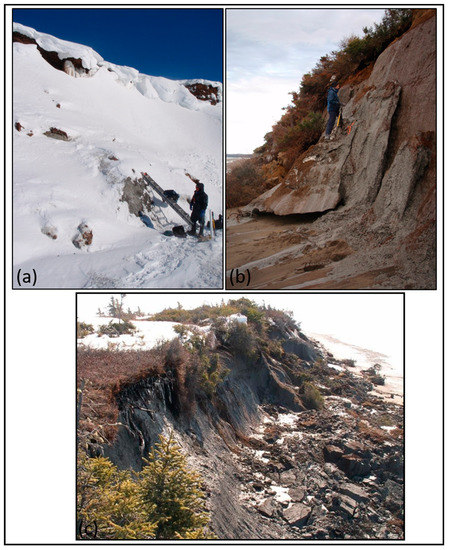 Studies on erosion of cliffs in cold regions have been numerous over the last two decades and have mainly focused on the calculation of historical erosion rates mostly at decadal scales [14,25,32,33,34]; and less often at annual or seasonal scales [27,35,36]. The quantification of erosion at high temporal resolution rarely exceeds a few years, and in rare cases ten years [30]. Short-term evolution also based on LiDAR data and helicopter, aircraft, or drone photogrammetry allows the quantification of coastline or shoreline retreat and eroded volumes [34,35,37,38,39]. The studies also focused on the influence of the geomorphology and lithology of the cliffs on the rates and modes of retreat [40,41] and on the different mechanisms and modes of block failures and landslides [12,26,42,43].