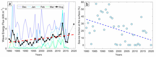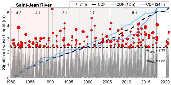 In order to explain the evolution of the cliff retreat rates, the offshore wave climate was investigated. A global wave model (WaveWatch III®; [69]) was implemented for the whole St. Lawrence Estuary and Gulf over a 1 km2 grid [70,71]. The time series of wave parameters (height, period), water levels and ice concentration for the nearest point off the Saint-Jean River coast were extracted from the model for the 1980–2020 period (no data before 1980, nor for between 2018 and 2019). The point corresponds to the closest location of an AWAC (acoustic wave and current profiler) mooring (14 m depth), which has been used to validate the wave model. Over the whole period, the 95th and 99th percentile of wave height is 1.52 m and 2.33 m respectively.