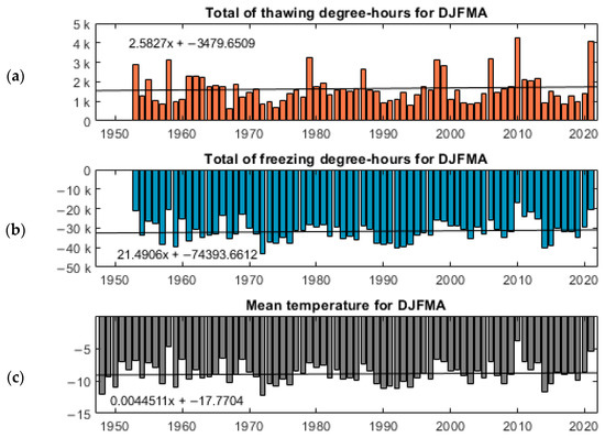 To assess erosion processes according to seasonal climatic variables, we have defined the season periods using daily minimal, mean, and maximal temperatures, after Bernatchez et al. [73]. The year has been defined in six seasonal periods. Summer is characterized by the absence of freezing. Early fall (Fall A) begins when temperatures drop below 0 °C for the first time. Late fall (Fall B) begins when mean air temperatures drop below 0 °C. Winter begins when the cumulative sum of maximal daily temperature of the subsequent deviation from 0 °C threshold remains negative. Early spring (Spring A) begins when the prevailing maximal air temperatures are positive (defined as the cumulative sum of maximal daily temperature of the subsequent deviation from the 0 °C threshold remaining positive). Late spring (Spring B) begins when mean temperatures exceed 0 °C. Following the above characterization, frost action during fall is typically superficial, and during winter, frost typically penetrates the sediment [52,74,75].