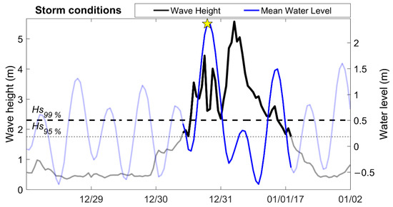 A storm detection was performed over the same time intervals used for cliff evolution: 1980–1983, 1983–1989, 1989–1997, 1997–2005, 2005–2017, and 2000–2020. However, the period from 1948 to 1980 was not covered due to the lack of wave data. A threshold approach allows identifying each storm event and its characteristics. A storm is detected when the wave height exceeds the 99th percentile, and the storm duration is the time interval through which the wave exceeds the 95th percentile [72].