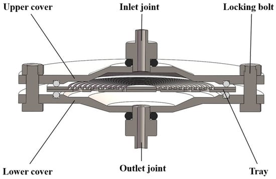We selected the flat filter as the working part, mainly composed of the upper cover, the lower cover, and the tray supporting the filter membrane. The top and bottom of the plate filter are designed with the pagoda joint as the inlet and outlet. Before filtering, the filter membrane should be placed on the tray flatly, and the upper cover should be installed to ensure that the sealing ring presses a circle around the filter membrane. The disassembly and installation process are relatively convenient. The tray is designed with spiral grooves on one side and circular holes on the other. Its function is to support the filter membrane and prevent large physical deformation of the filter membrane in the working process. The flat filter selected in this paper is made of 316 stainless steel, which has good structural strength and excellent corrosion resistance and can be installed with a 142 mm filter membrane. The diameter of the joint is 6.35 mm, and it is designed with a one-way valve. The inner diameter of the rubber tube is 7 mm. The physical figure of the plate filter is shown in Figure 3.