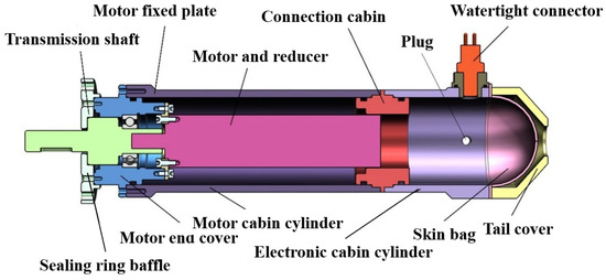 The motor is designed in the form of a pressure compensation rotary seal. A particular space is reserved at the back end of the motor, which can be placed into the drive plate of the motor. The oil-filled motor comprises a DC brushless motor, motor fixed plate, bearing, transmission shaft, sealing ring baffle, motor end cover, motor cabin cylinder, middle cover, electronic cabin cylinder, watertight connector, plug, skin bag, tail cover, and spring pressure cover. The structure diagram of the oil-filled motor is shown in Figure 4.