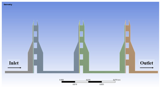 The left and right parts of the region are symmetrical, so to reduce the calculation amount of the simulation process, only half of it is intercepted in the actual modeling. The filter area is simplified to a porous medium layer of 0.4 mm thickness, close to the front of the tray. Three same flat filters connect with each other, and the pipe width is 8 mm. In the actual device, the plate filter is flat, and the gravity direction is from the inlet to the outlet, so the gravity direction in the modeling is left to right. The multi-stage membrane separation and filtration model established in Fluent software is shown in Figure 5.
