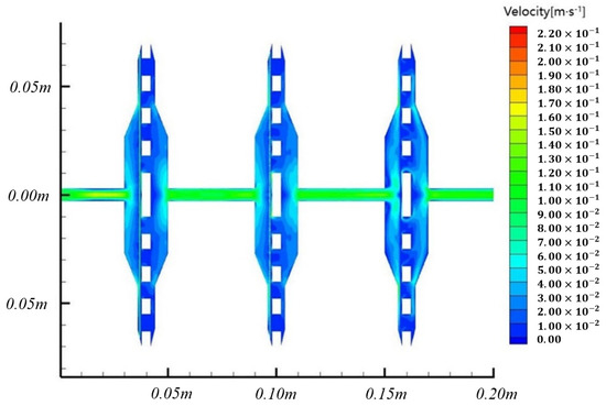 We used the Tecplot 360 software to post-process the simulation results. It has robust numerical simulation and CFD visualization functions and can directly read the cases and dat results files output by Fluent. In Tecplot, the flow field region is restored, i.e., mirroring the symmetric boundary. Firstly, the flow velocity cloud images inside the systems are generated for observation. Since there are only flow velocity I direction and y direction options in Tecplot, it is necessary to build a new combined flow velocity variable. When t = 5 s, the velocity contours inside the system are shown in Figure 6.