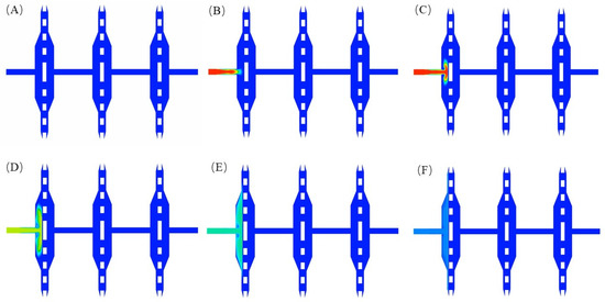 In the solution set, the inlet flow velocity was set to 0.1 m/s, and the inlet diameter was 8 mm. Then, the actual flow rate was around 300 mL/min, which was within the expected flow rate range of microbial membrane filtration. It can be seen from the cloud image of the results that the flow velocity in the four sections of the pipeline is stable at 0.1 m/s and below. When passing through each filter area, the liquid flow velocity decreased to a certain extent, consistent with the actual situation. The maximum flow velocity is about 0.22 m/s, which appears at the edge of the filter, where there is a small range of sharp corners. Therefore, it can be considered that the liquid flow velocity in the system is uniform during the multi-stage membrane filtering. The diagraw of volume fraction cloud images of 4 μm particles at different times is shown in Figure 7.