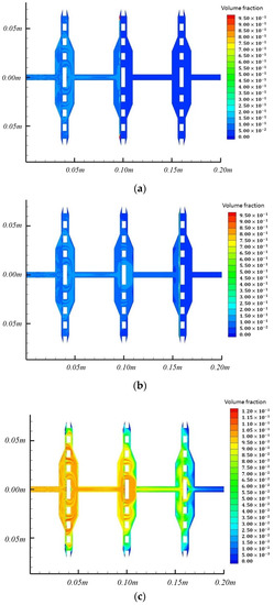 For comparison, the final volume fractions of 0.5 μm, 0.25 μm, and 0.08 μm particles are also recorded, as shown in Figure 8a–c. The 0.5 μm particles did not immediately pass when contacting the first filter membrane but first diffused in the area ahead of the filter membrane. The diffusion characteristics were similar to those of 4 μm particles. When the particles reach a certain volume fraction in a limited area, they gradually pass through the first filter membrane and continue to spread backward until the second filter membrane blocks them. Finally, they also tend to gather in the edge area of the second filter membrane. The particles of 0.25 μm and 0.08 μm also showed a similar diffusion pattern. The particles of 0.25 μm passed through the first and second filters and eventually gathered in the edge area of the third filter. The particles of 0.08 μm passed through all three filters.