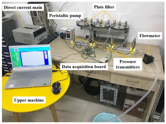 The central part of the multi-stage membrane separation filtration test system is three tandem flat filters, and a quantitative pump is used as the power source. In this paper, the DIPump550 intelligent peristaltic pump produced by the Kamoer company is used. The speed range is 0.1–550 r/min, and the maximum output flow rate is 550 mL/min. The maximum output pressure is 0.2 MPa, which supports the function of forwarding and reverse rotation and step-less speed regulation. It has three working modes: automatic cycle, semi-automatic cycle, and manual cycle. It is very suitable for membrane separation and filtration processes. Pressure transmitters are installed on both sides of each plate filter to record the real-time pressure in the pipeline. We used a PCM300 pressure transmitter, and the range was 0–0.16 MPa, the accuracy level was 0.5%, the output was 4–20 mA current signal. Four pressure transmitters were connected to the interface of the data acquisition board in turn, and real-time data were recorded through upper machine software. A flowmeter was set at the end of the pipeline system to observe and record real-time flow. Since the intelligent peristaltic pump used in this paper had the flow digital display function, the external flowmeter was only used as a reference. The connection and assembly of the test system were carried out on the workbench, and the physical diagram is shown in Figure 10.