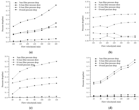 We tested four kinds of filter membranes of mixed cellulose ester, glass fiber, polypropylene, and polycarbonate to explore the flow velocity–pressure drop characteristics in the working process. The pore size of the filter membrane was 3 μm, 0.2 μm, and 0.1 μm, and the effective diameter was 142 mm. By changing the output flow rate of the peristaltic pump, the pressure data of four pressure transmitters in a period were recorded. After processing, the average pressure drop of each filter membrane was obtained, and the approximate relationship between pressure drop and flow velocity was obtained. The flow velocity–pressure drop curves of four kinds of filters is shown in Figure 11. And the flow velocity–pressure drop of four kinds of filter membranes is shown in Table 3.