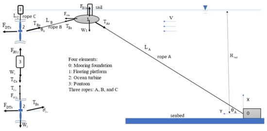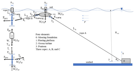 In this design, the floating platform and pontoons on the water’s surface are directly excited by the wave, and the exciting forces further affect the movement of the platform, pontoons, turbines, and the tensions of the ropes. The linear elastic model presented by Lin and Chen [2] is used to simulate the motion equation of the overall mooring system as follows.