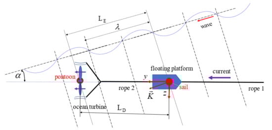 Because the turbine is subjected to the force of the ocean current, the direction of the system composed of the rope, the floating platform, and the turbine is in the direction of the ocean current. The relative angle α between the directions of current and wave is shown in Figure 3.