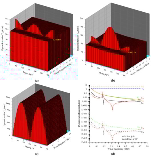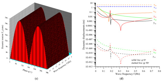 Figure 4a,b show the effects of wave frequency and phase on the dynamic tensions of ropes 1 and 2. It is found that the resonance frequency f is 0.182 Hz, and the maximum dynamic tensions are and , which is less than the breaking strength Tfracture = 759 tons. Moreover, the effect of phase is significant. When f = 0.182 Hz and ϕ = 0°, 180°, and 360°, the dynamic tensions are maximum. Figure 4c shows that if, ϕ = 0°, 180°, or 360°, the dynamic tension of the rope 3 is under the breaking strength Tfracture. However, for other phases, the dynamic tension is over the breaking strength Tfracture, especially for ϕ~90° or 270°. The maximum tension TCd,max = 11,411 tons. Figure 4d shows the effect of wave frequency on the dynamic displacements and for ϕ = 0° and 90°. Ιt is found that, for ϕ = 0°, the elongation of rope 3, is very small. Therefore, the corresponding dynamic tension, , is small. However, at ϕ = 90°, the elongation of the rope C, is very large. Therefore, the corresponding dynamic tension is very large. Moreover, it is well known that, if the turbine is more stable, its performance of power generation can be kept high easily. When ϕ = 0°, the amplitudes of dynamic displacement of the turbine are very small. At the resonant wave frequency f = 0.182 Hz, the amplitudes of dynamic displacement of the turbine are and . When ϕ = 90°, the amplitudes of dynamic displacement of the turbine are negligible. In other words, this mooring system can keep, effectively, the stability of the turbine.