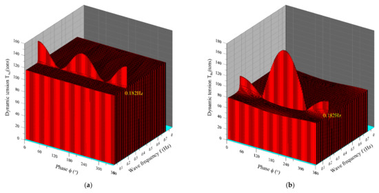 Figure 6 demonstrates the effect of wave height HW on the maximum dynamic tensions and in the domains of wave frequency and phase, and . The inclined angle of rope 2, . The corresponding length of rope B, LB = 345.5 m. The effective spring constants of the ropes A, B, and C: , , . The other parameters are the same as those in Figure 4. It is found that the larger the wave height HW is, the larger the maximum dynamic tensions are, especially for .