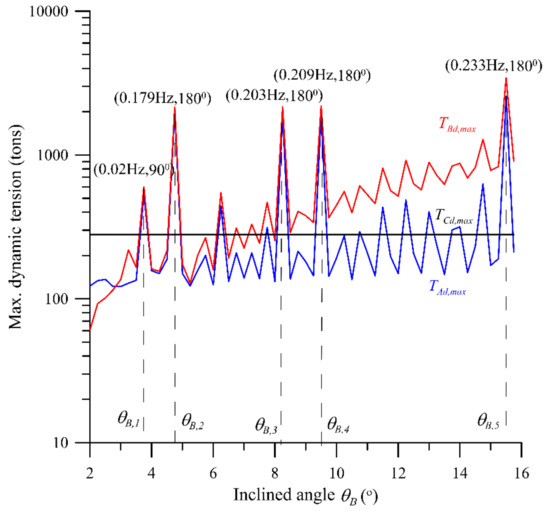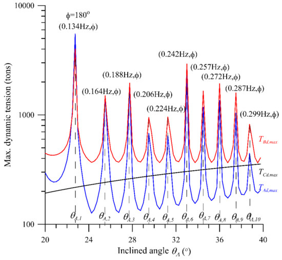 Figure 9 demonstrates the effect of the inclined angle θ1 of rope 1 on the maximum dynamic tensions and in the domains and . Except for the inclined angle θ1, the corresponding effective masses and , and the effective spring constant , all the parameters are the same as those in Figure 6. It is found that, if , and the wave frequency is the resonant one and the phase , the dynamic tensions and are over the fracture strength Tfracture. However, if the inclined angle is not in the neighbor of , the wave frequency is not the resonant one, or the length L4 is adjusted so that the phase , the dynamic tensions and are less than the fracture strength Tfracture. The larger the inclined angle is, the larger the maximum dynamic tension of rope C is. Because the structure of system depends on the inclined angle , the natural frequency of the system changes with the inclined angle . There exists several resonant frequencies, as shown in Figure 9.