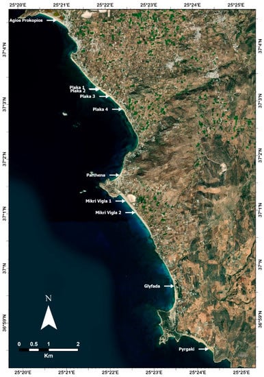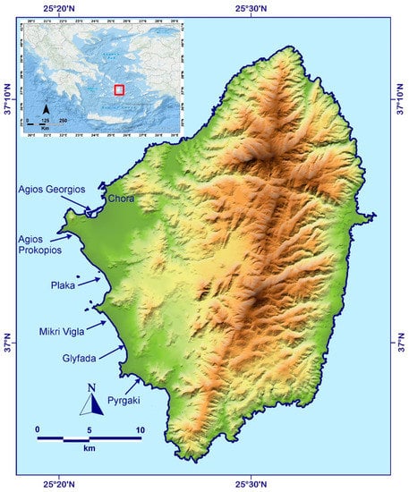 - Evelpidou, N.; Pavlopoulos, K.; Vassilopoulos, A.; Triantaphyllou, M.; Vouvalidis, K.; Syrides, G. Holocene palaeogeographical reconstruction of the western part of Naxos island (Greece). Quat. Int. 2012, 266, 81–93. [Google Scholar] [CrossRef]