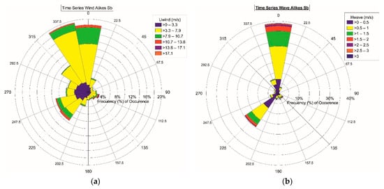 The wind, which plays a key role in the formation and evolution of the dune fields, is characterized by a predominance (>60%) of northerly winds (Etesian Meltemi) []. The southerly winds represent about 25%, while the westerly and easterly winds occur only occasionally. The trend is similar when considering the storm winds (>7 on Beaufort scale). According to 10 years of data (1995–2004), on an annual basis, the most common propagating ripples originate from the 0° and 225° areas, with an incidence of 38% and 25% respectively (Figure 2a). The average value of the significant wave height is 0.73 m, with typical values between 0–0.5 m, while the maximum value of the significant wave height is 5.6 m with direction N–NW (area 352°) (Figure 2b). The highest significant wave heights originate from the N and SW directions (area 345–10° and 225°) []. With respect to fetch length, it extends to 40 km for the northern direction, (extending up to Mykonos Island), 55 km for the southeastern direction (extending up to Sikinos and Folegandros islands), and to 30 km for the southern direction, limited by Ios island.