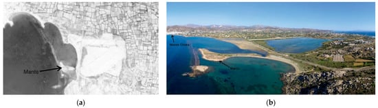 The development of Agios Georgios tombolo was studied using aerial photographs from 1960 until today. From the study of the aerial photographs of 1960, 1988 and 2015 the tombolo shape has changed. In 1960 the small island of Manto was connected to the rocky islet on the west. Beachrocks are also present on the north shore of Manto. In 1960 the islet’s distance from the shore was 22.90 m and covered an area of ~3230.2 m2. During 1988, its morphology has changed and the distance from the shore was decreased to 16.60 m and its covering area was reduced to ~3000.6 m2 (Figure 4a). Additionally, it can be observed that a narrow land that was once connecting Manto and the rocky islet was submerged. During fieldwork in 1997–2000 [], the rocky islet was still submerged along with three beachrock slabs. Today, the tombolo is formed between the Manto islet and the main coast of the island and it is even possible to have access by foot (Figure 4b). The area of Manto has been reduced between 1960 and 1988 by 53.47% []. Nowadays, the area reaches 25,861.7 m2.