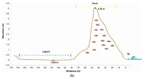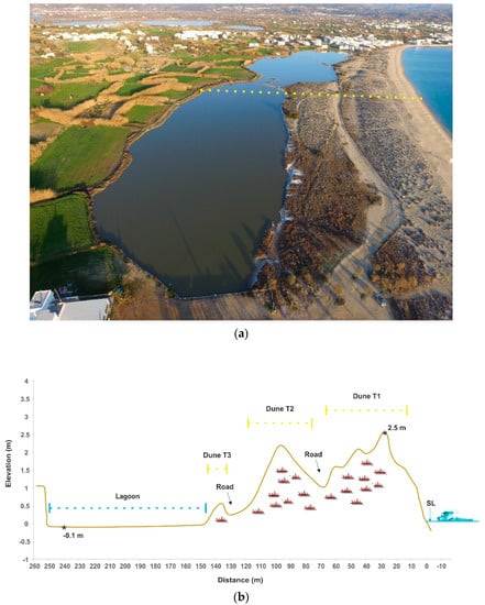 (a) Aerial photograph of Agios Prokopios dunes and lagoonal system, with the location of the cross section; (b) Cross section of Agios Prokopios site.
