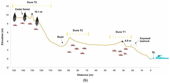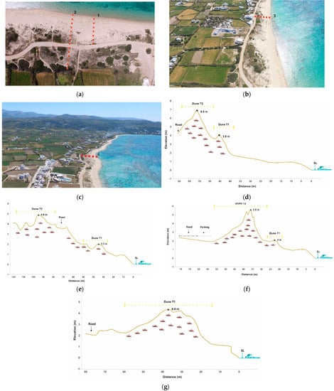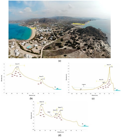Three cross sections were performed at Mikri Vigla area (Figure 7b–d). The first cross section, Mikri Vigla 1 (Figure 7b), was accomplished on Parthena beach, north of Mikri Vigla village. This cross section indicates two series (T1/T2) of dunes. The T1 dune has a width of 6 m and a maximum elevation at 3.7 m. T2 dune follows with a width of 24 m forming two ridges with maximum elevation at 6.8 m. Both dune series are covered by vegetation.