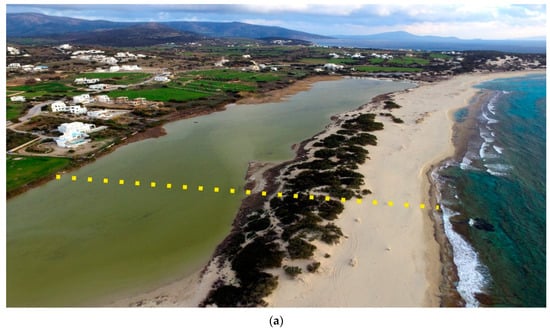 The coastal zone of Agios Prokopios has a length of 1100 m and a width ranging between 15 m and 124 m, while the coast has a gentle dip of 8°. The coastal area is characterized by the presence of sand dunes and a lagoon. The dunes are extensive and cover an area equal to 2/3 of the beach. This area, during the summer months, is used as a parking space. Behind the dunes there is a lagoonal system, parallel to the coastline (Figure 5a). During summer, when the water table is lower, the lagoon dries up and it is separated into three lagoons. The presence of sand dunes also functions as a natural barrier to the water communication of the three seasonal lagoons with the sea. The coastal zone of Agios Prokopios is partially delimited by the arbitrary and irregular road network that has been developed on the dunes, which limits the width of the land beach to 15 m and by a sequence of low dunes with vegetation.