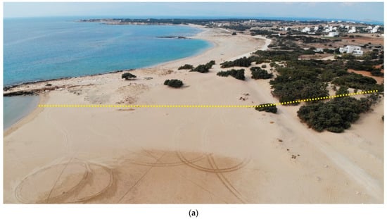 The coast of Mikri Vigla has a total area of 2 km2 and features two natural coastal lagoons clustered on a 0.2 km stretch of the coast, extensive transitional sand dune systems and a temporary pond formed between the lagoons (Figure 7a). Also, the planting of trees by humans in the sand dunes reflects the desire to protect the dunes or houses near the dunes, especially at the eastern part of the study area, where human constructions were built directly on the dunes. The dunes’ shape is semicircular, with a total length of 678 m and a width 20 m.