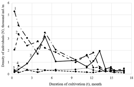 Changes in the density of mollusks (N, thousand ind./m) during the cultivation of mussels (t, month) on the 1st type of collectors (ω = 0.09). The starting point on the abscissa is May of the current year Each curve is one cycle of mussel growing (hereinafter, the starting point on the abscissa is May).