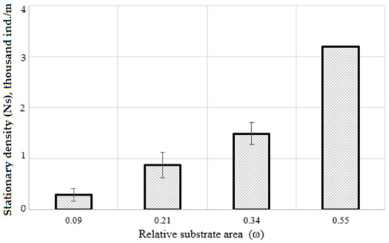In our studies on the cultivation of mussels, similar features were observed due to the structure of the substrate. Thus, each type of substrate was characterized by a certain average stationary (equilibrium) number (Figure 1, Equation (3)), which closely correlates with their relative substrate area (ω). At the same time, the dynamics of the abundance on different types of substrate was approximated by an exponential function that significantly differed from one (1.32 ± 0.12), i.e., the number of mollusks steadily increased with the increase in the collector area. It also should be noted that, if we change the variables in Equation (3) and represent the ω as a function of the Ns, then the equation will take the following form: