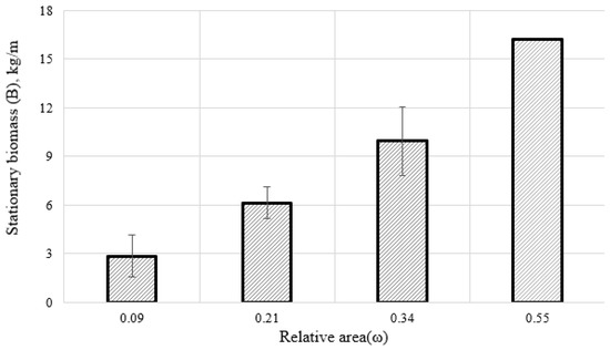 In parallel with the decrease in the number, an interconnected but oppositely directed process took place on the collectors, i.e., an increase in the biomass of mollusks (B). It was found that during the cultivation cycle there are periods of a sharp increase and decrease in the mollusks’ biomass. However, then the biomass stabilized near a certain, stationary, quasi-equilibrium level (Bs) associated with the area of the substrate. Thus, it means that this biomass came into a state of dynamic equilibrium. In particular, on the 1st type of collectors (ω = 0.09), the stationary mollusks’ biomass was 2.6 + 0.64 kg/m. A similar dynamics of biomass was observed on other types of collectors, differing mainly only in quantitative values. On the 2nd type of collectors (ω = 0.21), the final biomass stabilized at 6.2 ± 0.48 kg/m, while on the 3rd one (ω = 0.34) it was 10.0 ± 1.06 kg/m (Figure 3 and Figure 4). On the 4th type (ω = 0.55), the relation between the biomass and the area of the artificial substrate was 16.2 kg/m.