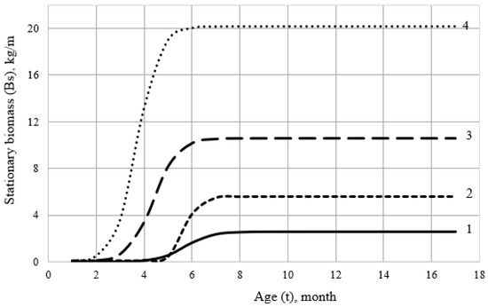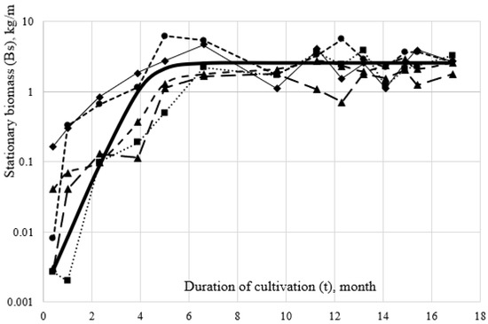 Figure 5 shows the calculated (theoretical) curves based on the above-mentioned Pearl–Verhulst logistic equation. It clearly shows that the 2nd inflection point of the logistic function, which characterizes the position of the asymptote of the biomass curve on different types of substrate, is noticeably different. On the 1st type of collector, its numerical values of this point are 2.2 kg/m, the 2nd and 3rd ones are, respectively, 2.8 and 5.4 kg/m, while on the 4th it equals 10, 1 kg/m. At the same time, it can be seen in Figure 5 that the average biomass in collectors with larger values of the ω along the abscissa axis shifts to the left, i.e., reaches the equilibrium (stationary) state faster (Appendix A).