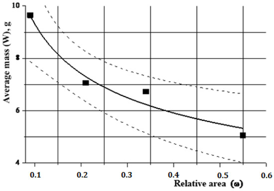 The same data can be analyzed from different points of view. The area of the substrate shown in Figure 6 shows the results of regression analysis (performed in the statistical package “Microcal Origin-8.5”) (ANOVA, Analysis of variance (New Providence, NJ, USA)) associated with changes in average weight (W) on substrates with different relative surface area (ω). Dashed lines represent 95% confidence interval.